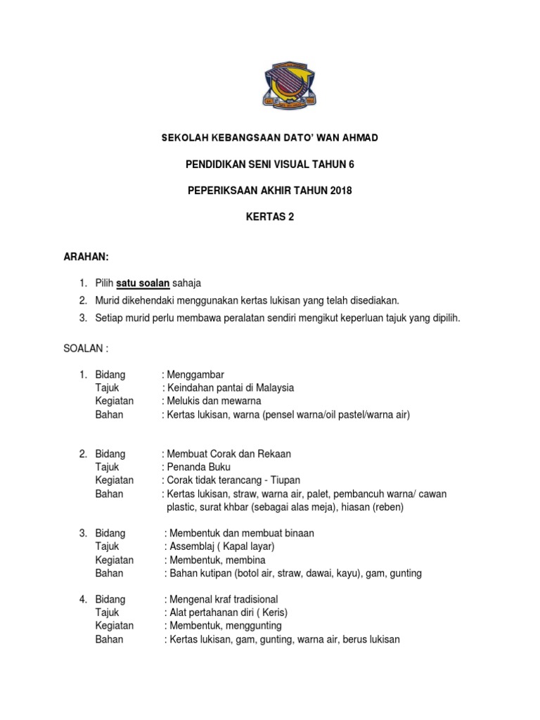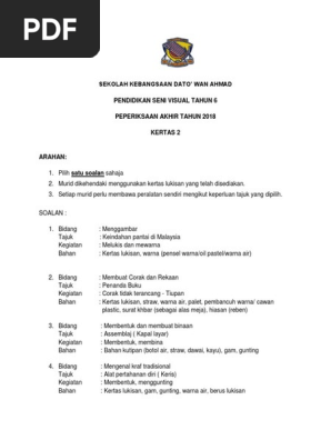 Sebelum bermula cuti sekolah murid perlu melalui ujianpeperiksaan. Web Peperiksaan akhir tahun oktober 2017 tahun 6 soalan pendidikan seni visual tahun 6 pilih 1 soalan sahaja. Rancangan Pengajaran Harian Pendidikan Kesenian PSV Tahun 2 2018.